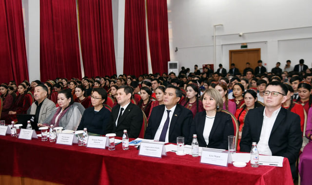 В актовом зале встретились туркменские студенты, обучающиеся в Алматы. Им рассказали о результатах заседания Халк Маслахаты Туркменистана 19 сентября 2025 года и о значении Конституционного Закона «О правовых основах политики мира и доверия Нейтрального Туркменистана».