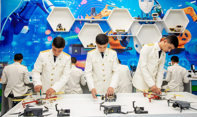 Кадеты решали прикладные задачи, демонстрируя техническую подготовку и навыки работы с современными технологиями. Учитель информатики Мурат Гельдыев отметил, что школа оснащена новейшим оборудованием: здесь есть классы робототехники, лазерные тренировочные залы и зал бодифлайтинга.
