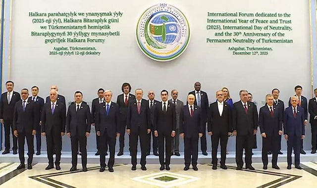 Участники форума «Мир и доверие: единство целей в интересах устойчивого будущего» сделали совместное фото. Мероприятие проходит в Ашхабаде 12 декабря, сообщает информационный центр "Известия".