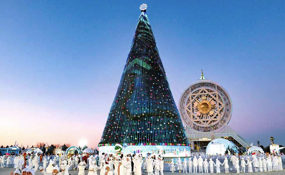 Традиционно эпицентром новогодних мероприятий в Ашхабаде становится площадь у культурно-развлекательного центра «Алем». Здесь установлена главная ёлка страны, поражающая масштабом, изысканным декором и яркой подсветкой. Вечерний город приобретает особенно нарядный облик благодаря многочисленным ёлкам и световым композициям, создающим атмосферу настоящей зимней сказки.