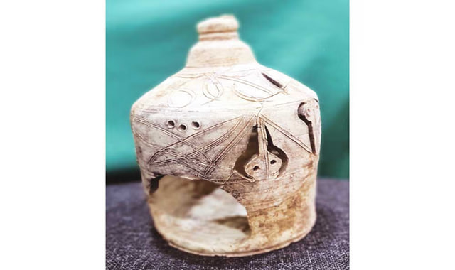 Артефакт высотой около 20 сантиметров выполнен из светлой пористой терракоты. Он сочетает практическое назначение и художественное оформление. Форма повторяет архитектурные традиции Газневидов и ранних Сельджуков: устойчивое основание, куполообразный корпус и горлышко, напоминающее миниатюрный минарет.