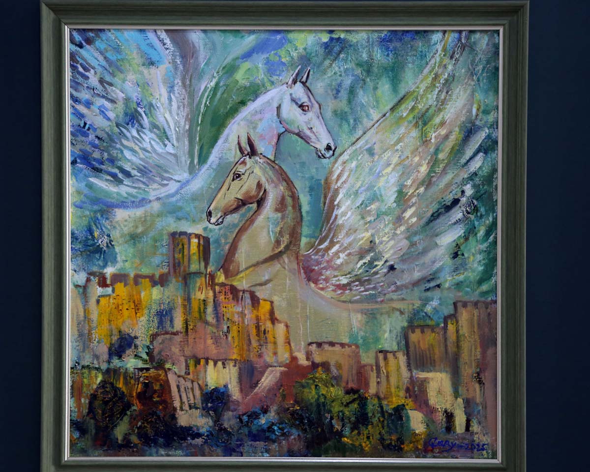 Центральное место в экспозиции занимает полотно Овгана Овганова «Небесные скакуны». Пять белоснежных ахалтекинцев, стремительно мчащихся навстречу зрителю, словно раздвигают границы реальности. Их движение наполнено энергией и свободой, создавая ощущение, что ещё мгновение — и кони воспарят над землёй. Эта работа давно стала знаковой и неизменно притягивает внимание посетителей.