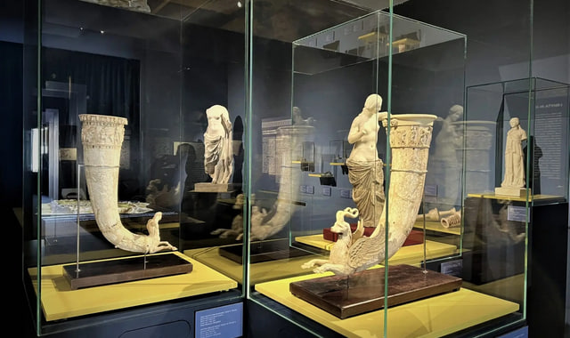Среди главных экспонатов — ритоны из слоновой кости. Эти сосуды из Нисы соединяют греческий эллинизм и восточную роскошь в уникальном стиле, который Рим так и не смог воспроизвести.