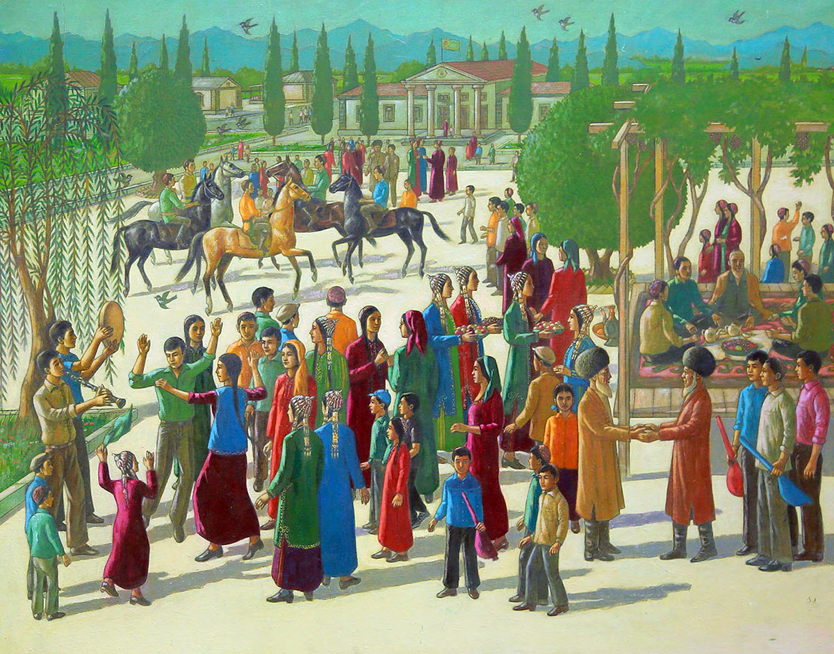 На этом фоне особенно выразительно воспринимаются работы туркменских художников — «Той» Мамеда Мамедова, «В предгорьях Копетдага» Ярлы Байрамова, «Два друга» Владимира Маскевича и другие. Их произведения демонстрируют академическую выверенность, конкретность образов и глубокое понимание визуального и духовного обаяния ахалтекинских коней.