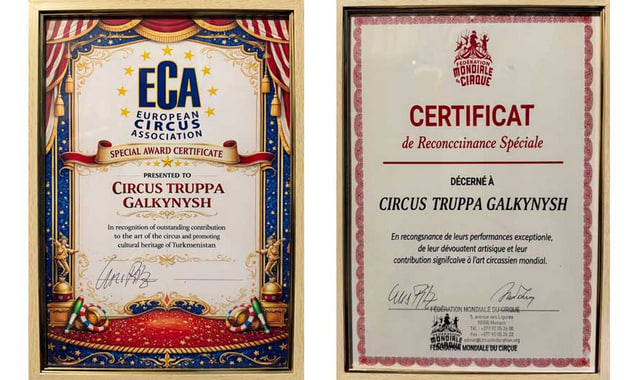 Группе национальных конных игр «Galkynyş» вручены международные сертификаты Всемирной федерации цирка и Европейской цирковой ассоциации. Награды присуждены за вклад в развитие циркового искусства. Церемония прошла в рамках 48-го Международного фестиваля циркового искусства в Монте-Карло, передает информационное агентство TDH.