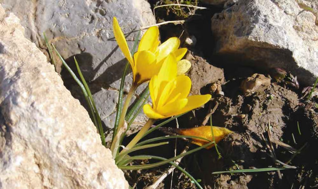 Раннецветущие однолетники и эфемероиды первыми откликнулись на весну. На открытых участках почвы появились ярко-желтые «звездочки» гусиного лука, за ними — розетки мерендеры Кессельринга. Особое внимание привлекает шафран Королькова — эндемик Койтендага, пробивающийся сквозь остатки снега.