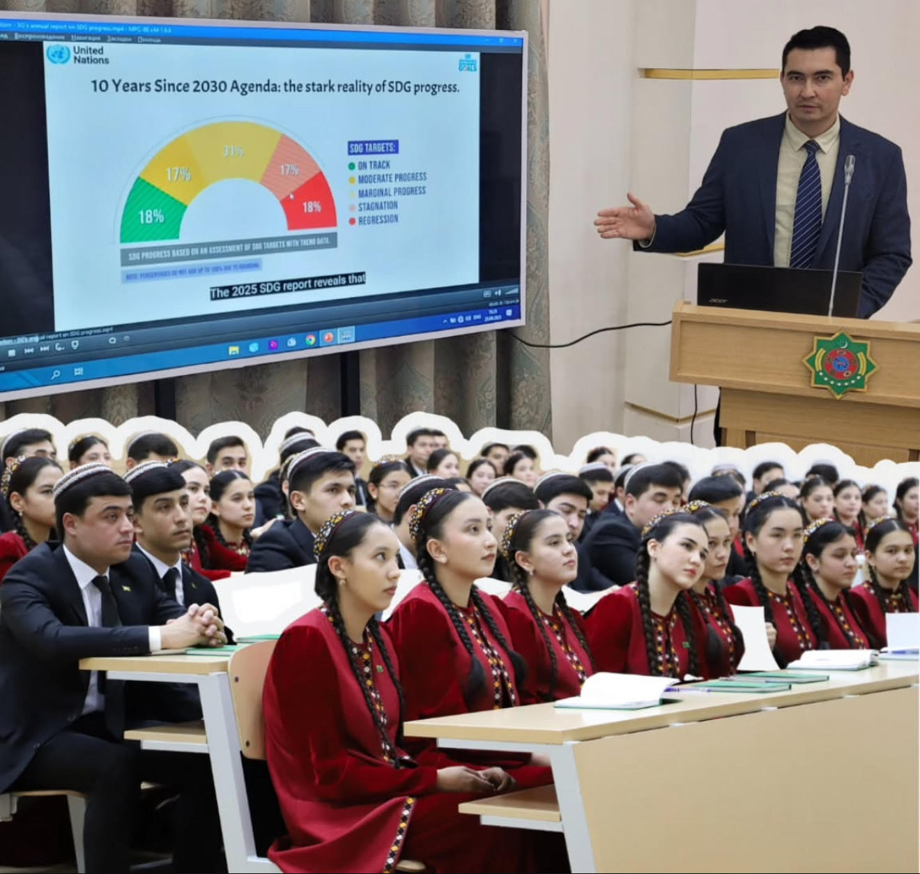 В Туркменистане состоялась лекция, посвящённая Целям устойчивого развития (ЦУР), организованная при поддержке специалиста по управлению данными и отчётности Постоянного координатора ООН Гелди Мырадова, сообщает МИЦ.
