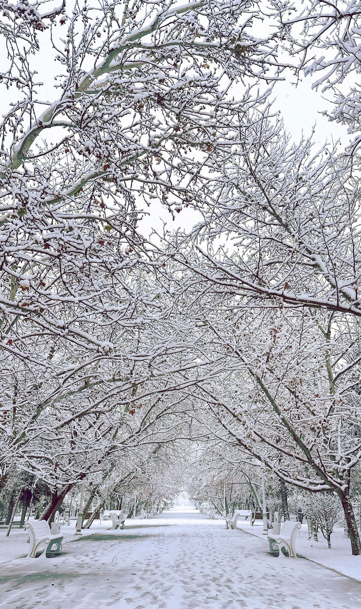 Неповторимую красоту приобрёл парк «XV лет независимости Туркменистана». Его аллеи и ландшафты оказались укрыты ровным снежным полотном, символизируя чистоту, спокойствие и начало нового этапа.
