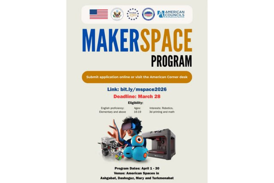 Американский центр в Ашхабаде объявил набор участников на 10-дневную программу «Makerspace», которая включает мастер-классы по робототехнике, 3D-печати, электронике, математике и виртуальной реальности. Об этом информирует новостной сайт Turkmenportal.
