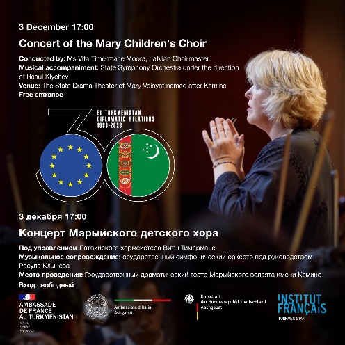 Представительство Европейского Союза в Туркменистане приглашает жителей города Мары и Марыйского велаята на концерт детского хора Марыйской школы искусств. Хор выступит в сопровождении Государственного оркестра под управлением Расула Клычева и специально приглашенной из Латвии хормейстера Виты Тимирман.